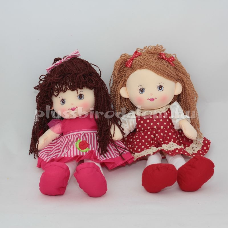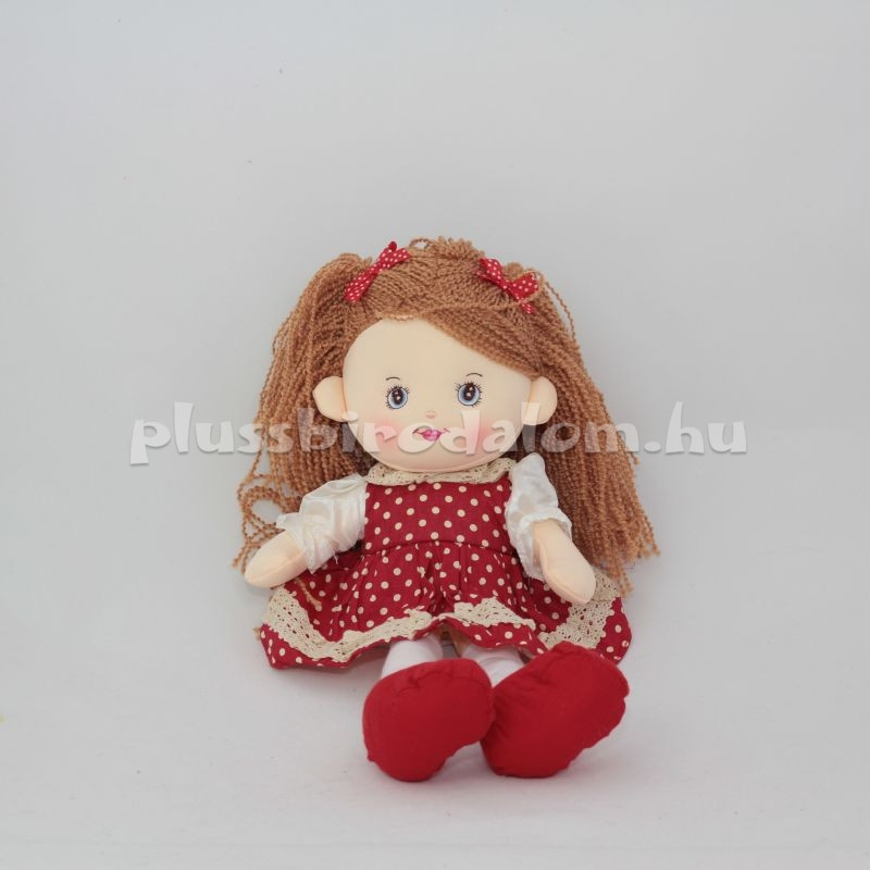 Plüss rongybaba, világosbarna kibontott hajjal, piros-fehér pöttyös masnival a hajában,
