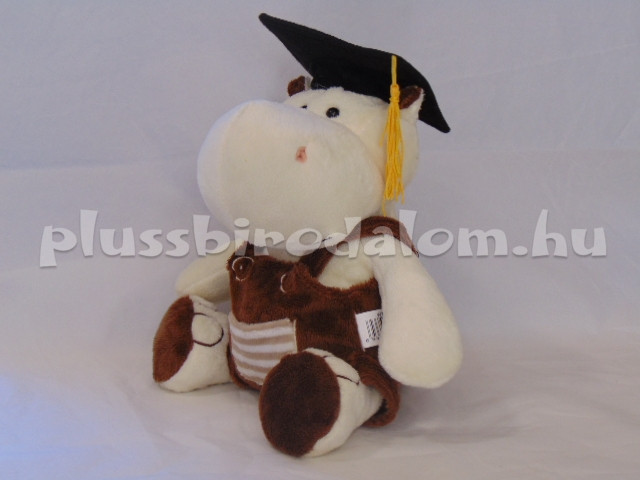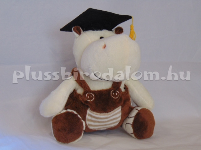 Ülő,vajszínű, barna nadrágban, ballagó sapkában. 20 cm