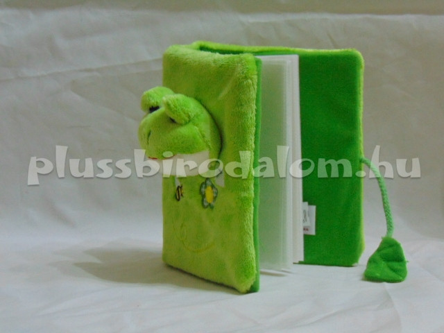 Plüss borítású fotóalbum, világoszöld színű, béka fejjel az elején.