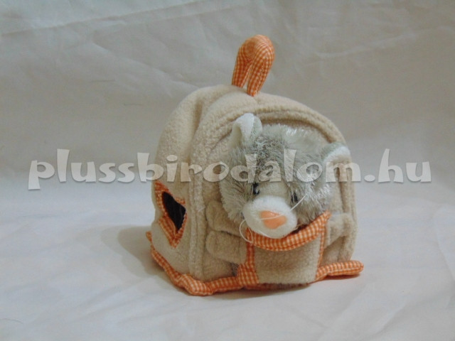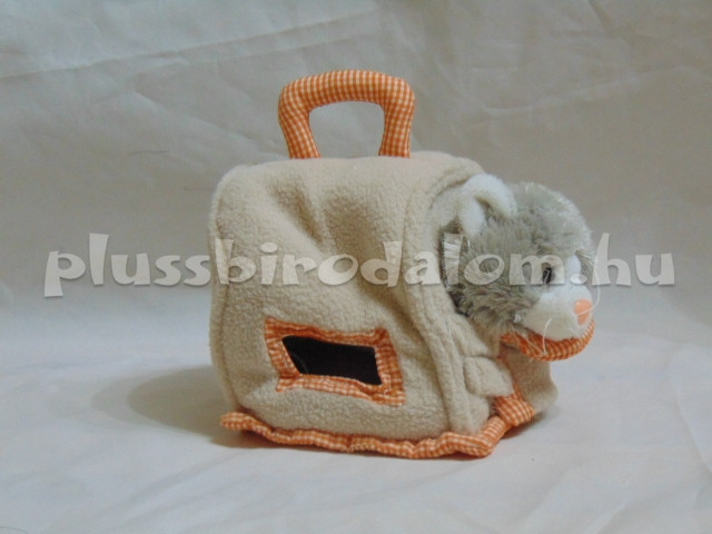 Plüss szürke színű Cica figura, plüss drapp színű házikóban, fogantyúval.