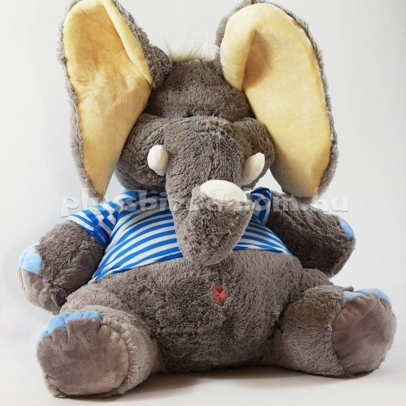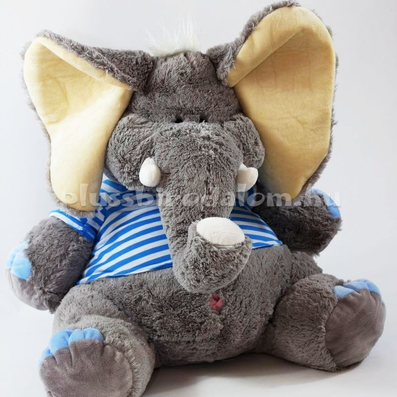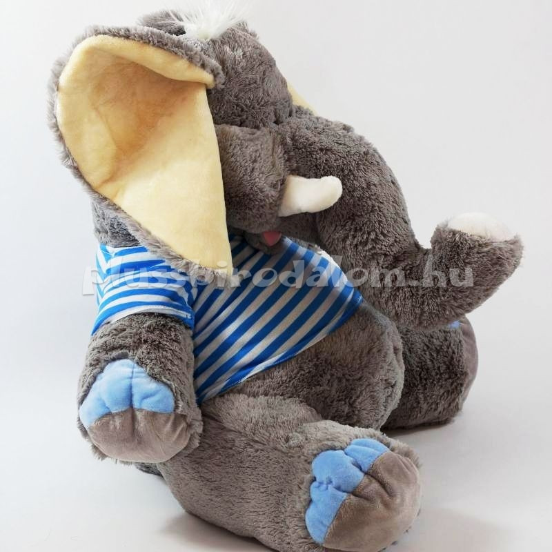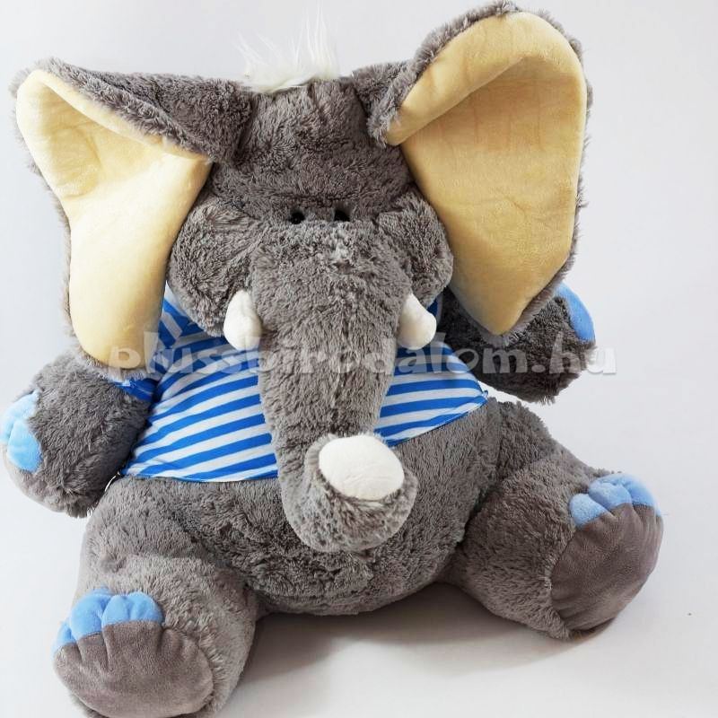 Óriás Plüss elefánt, ülő, kék csíkos pólóban. 50 cm
