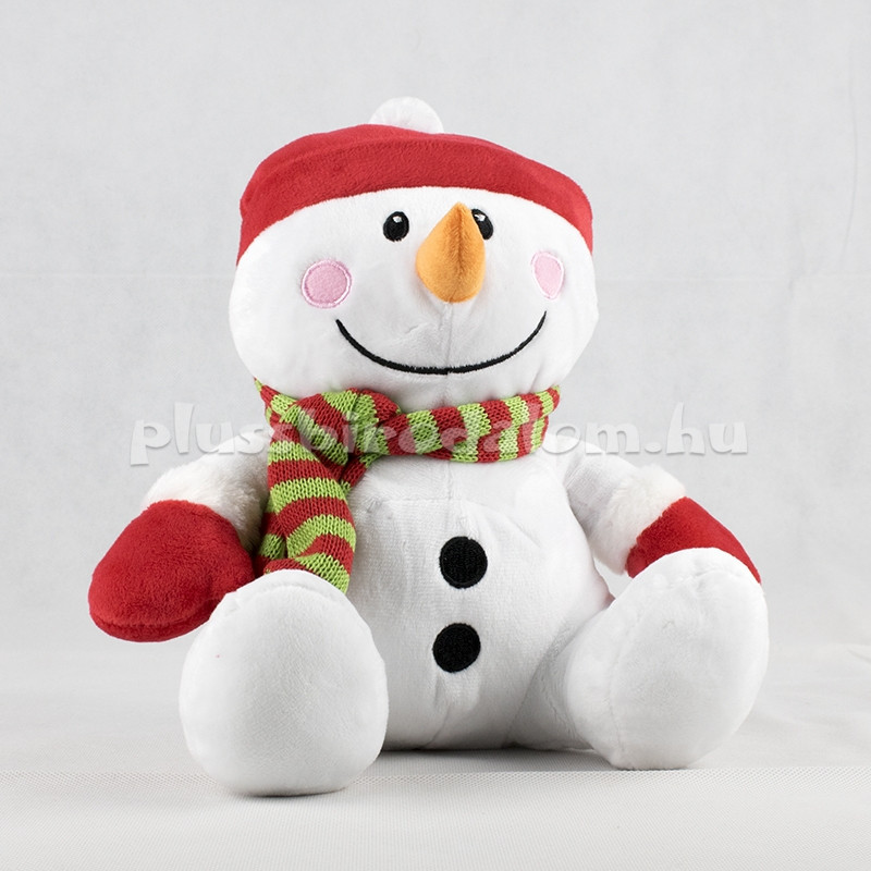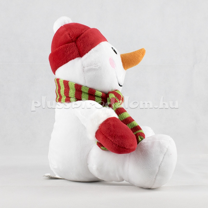 Plüss Hóember figura, piros sapkában, kesztyűben, csíkos sállal 20 cm