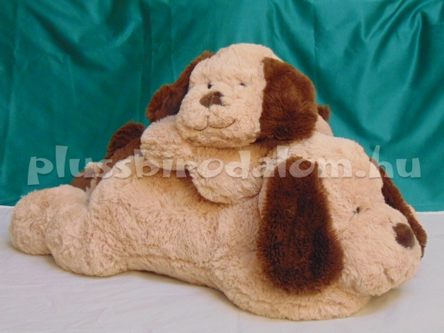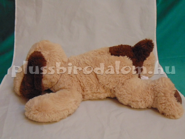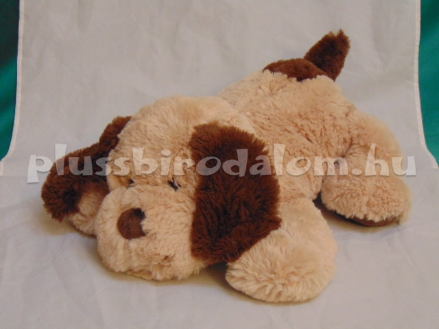 Plüss kutyus figura, fekvő, világosbarna-sötétbarna színben.