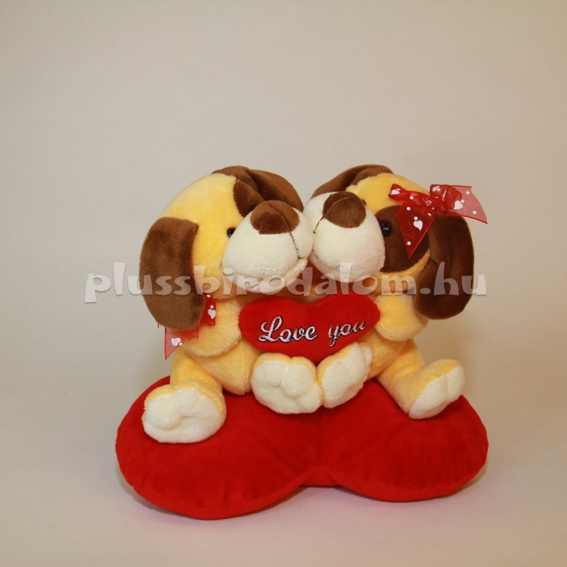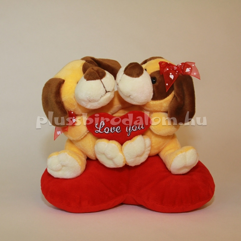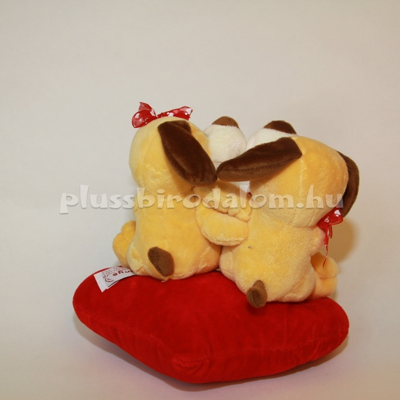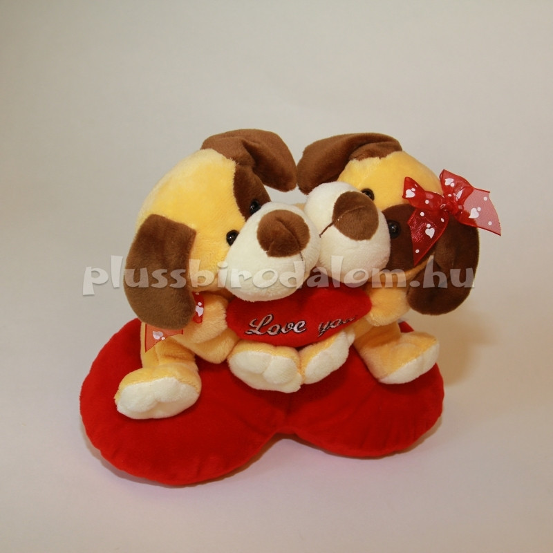 Sárga-barna-foltos színű, piros szívecske párnán ülő, fiú-lány kutyuspár, piros szívecskével a mancsunkban.
