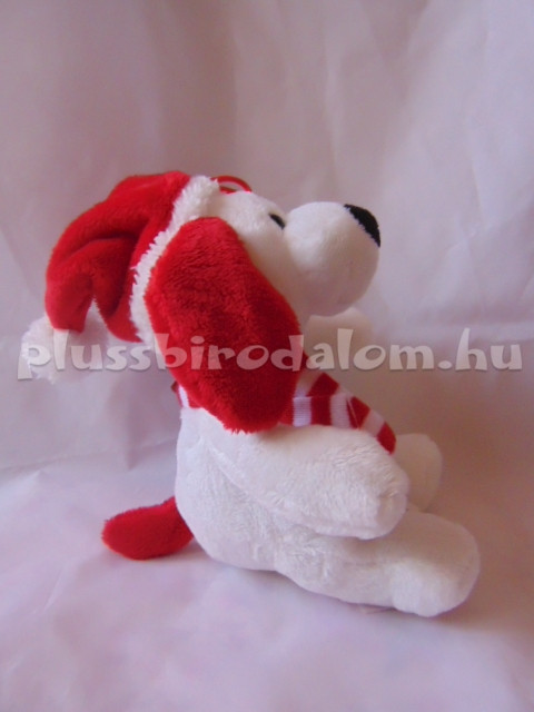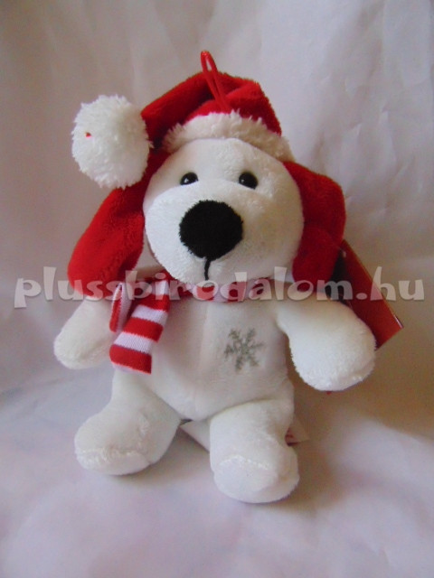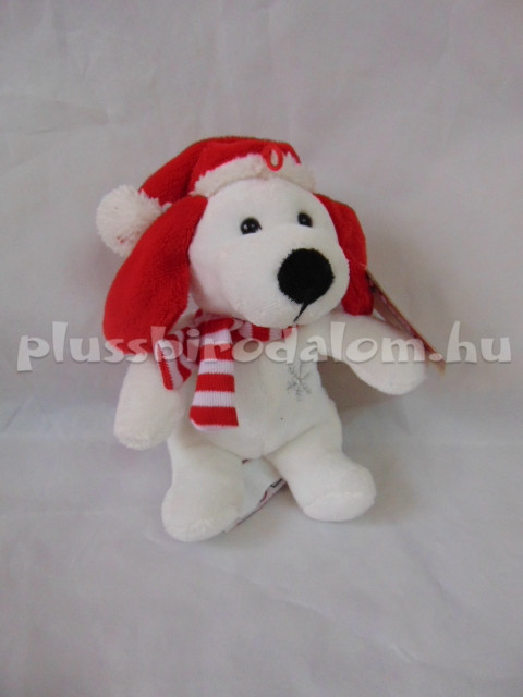 Piros fülű, fehér kutyus plüss figura,télapó sapkában, piros-fehér csíkos sállal. 15 cm