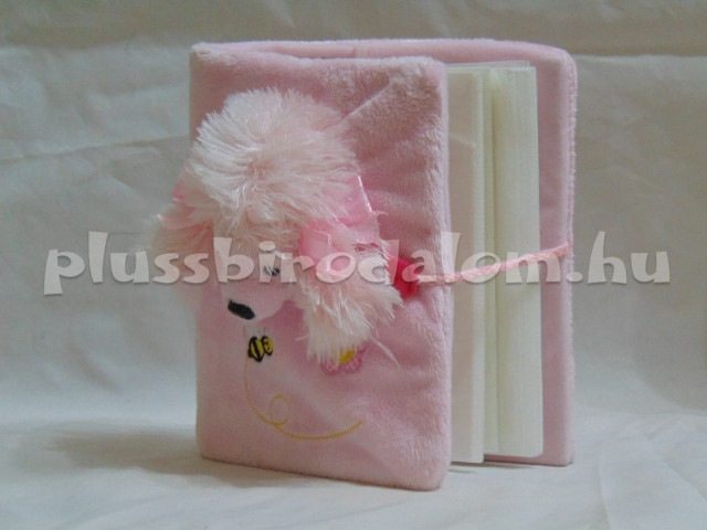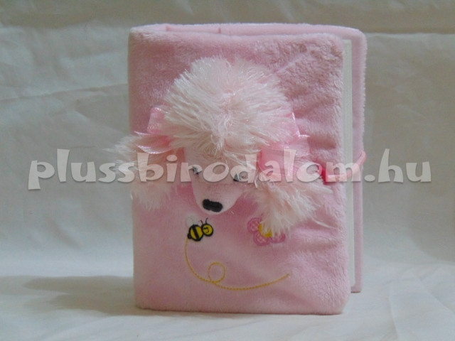 Plüss borítású fotóalbum, rózsaszín színű, kutyus fejjel az elején.