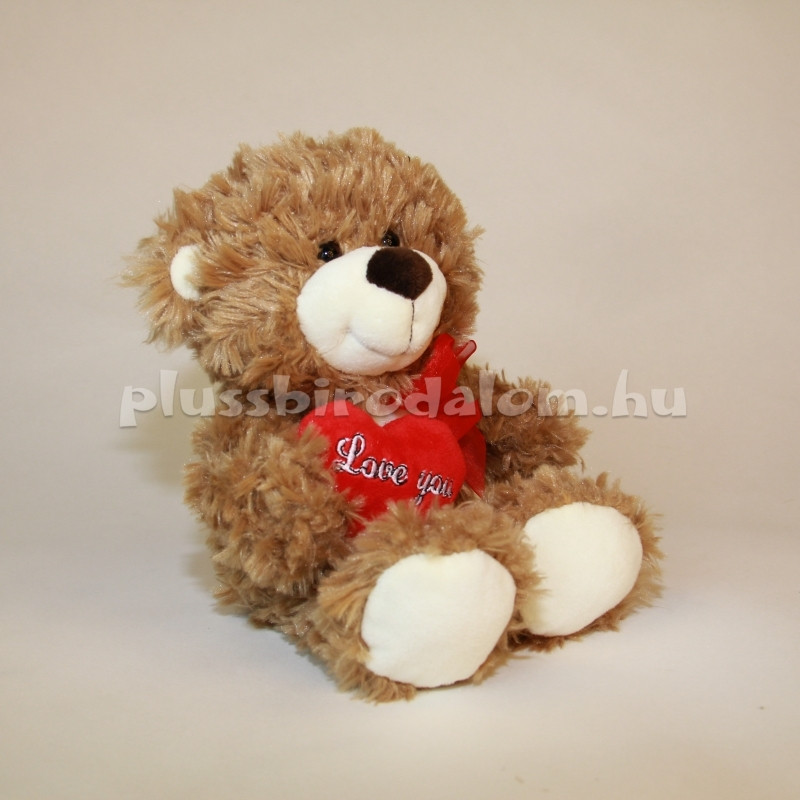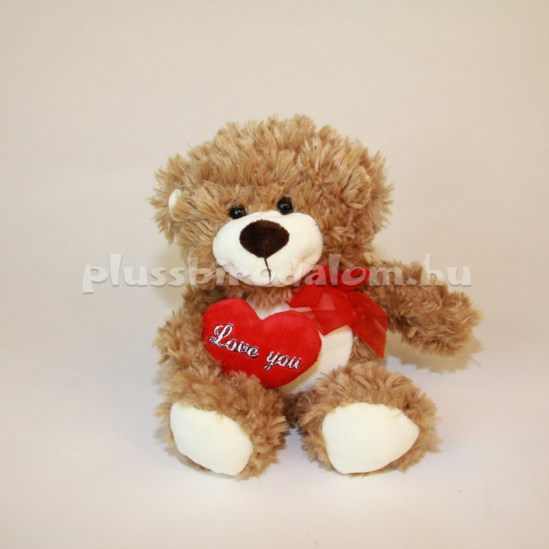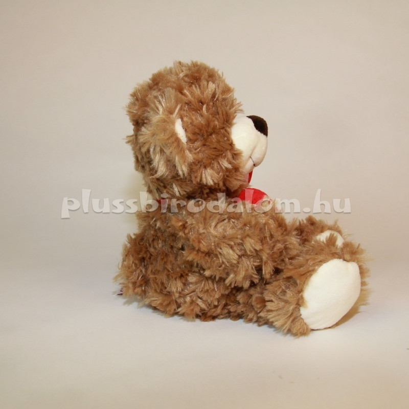 Barna színű, ülő kivitelű, piros masnival a nyakában, piros szívecskével a mancsában.
