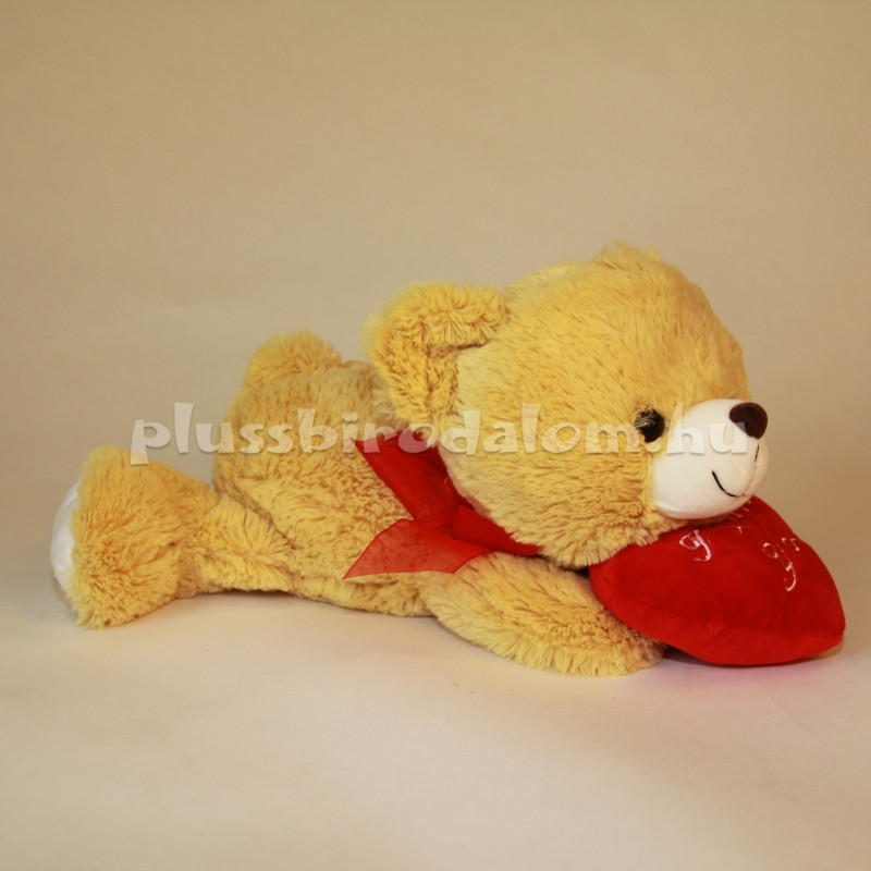 Zsemleszínű, fekvő kivitelű, piros masnival a nyakában, piros szívecskével a mancsában.