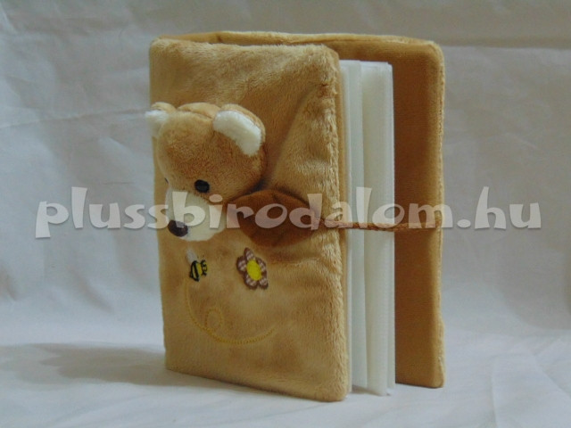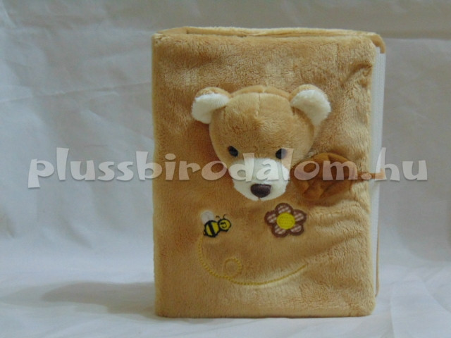 Plüss borítású fotóalbum, világosbarna színű, maci fejjel az elején.