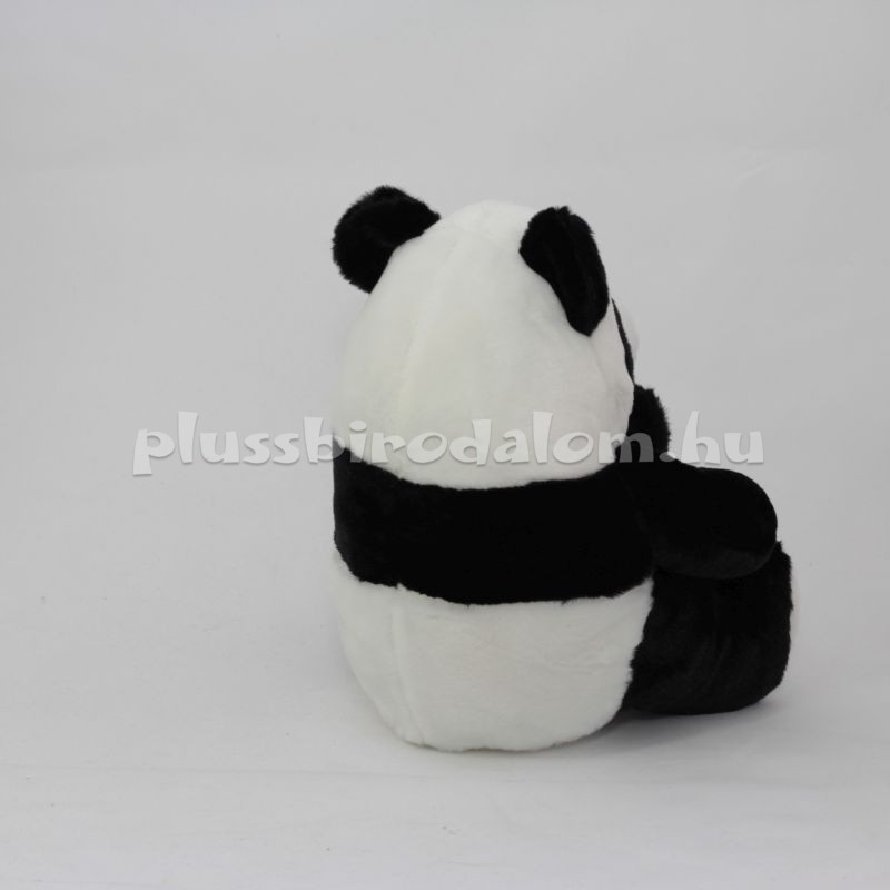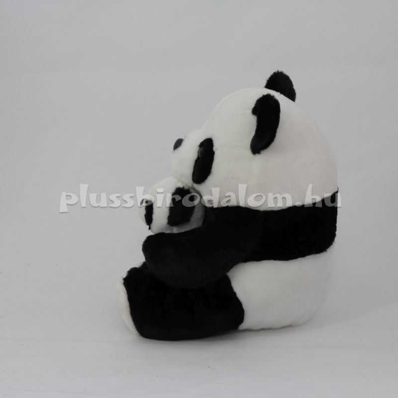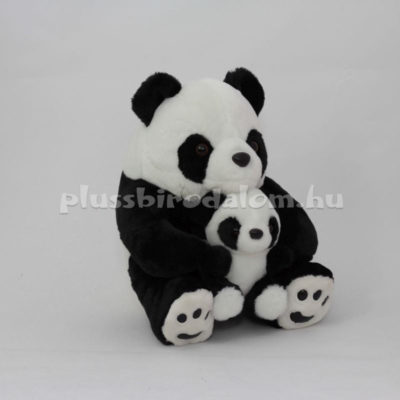 Plüss panda mackó figura, anya kölykével, ülő, fekete-fehér színű.