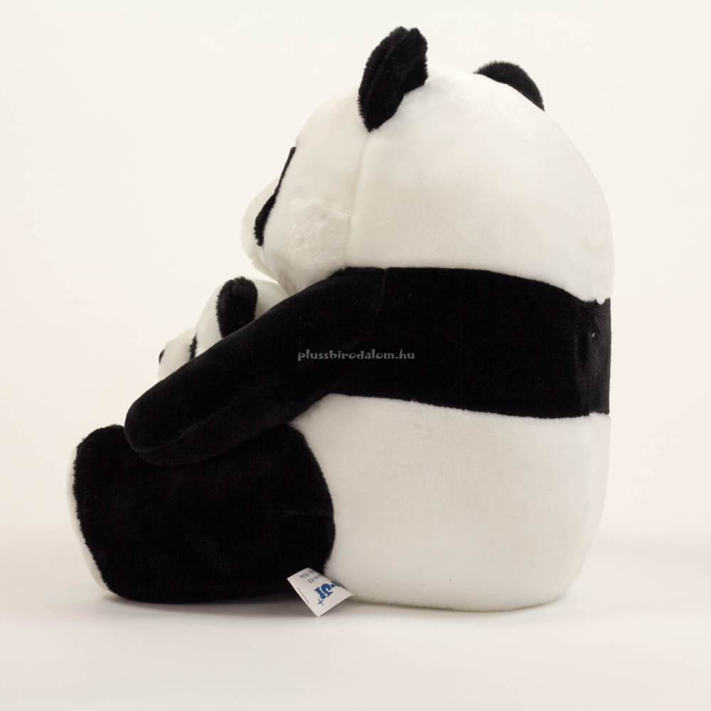 Plüss panda mackó figura, anya kölykével, ülő, fekete-fehér színű.
