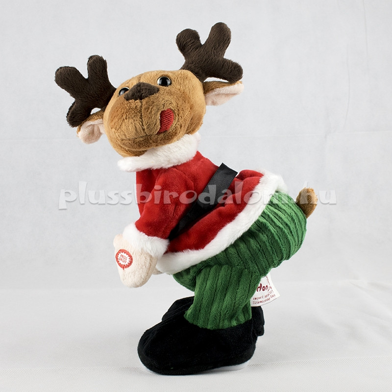 Plüss zenélő/táncoló Rénszarvas figura Mikulás jelmezben 25 cm
