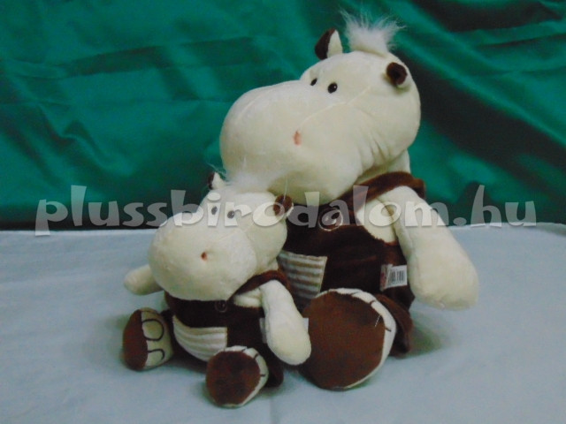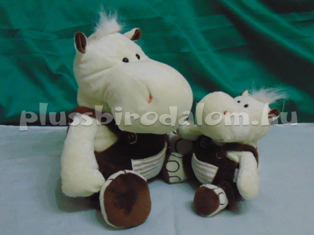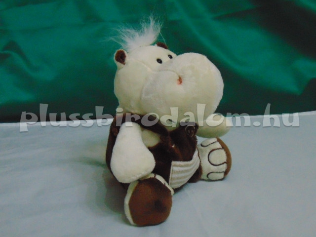 Plüss Víziló figura. Ülő, vajszínű, barna nadrágban.