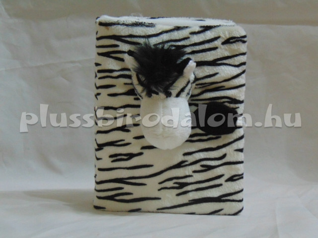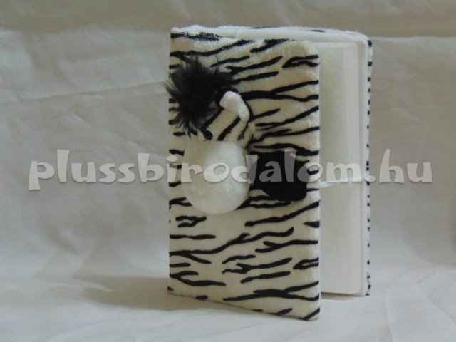 Plüss borítású fotóalbum, zebramintás, zebra fejjel az elején.