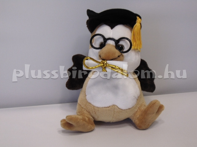 Ülő, világosbarna-fehér színű, ballagó sapkában, "diplomával" a csőrében. 16 cm