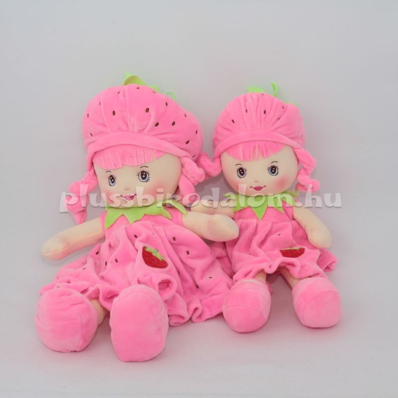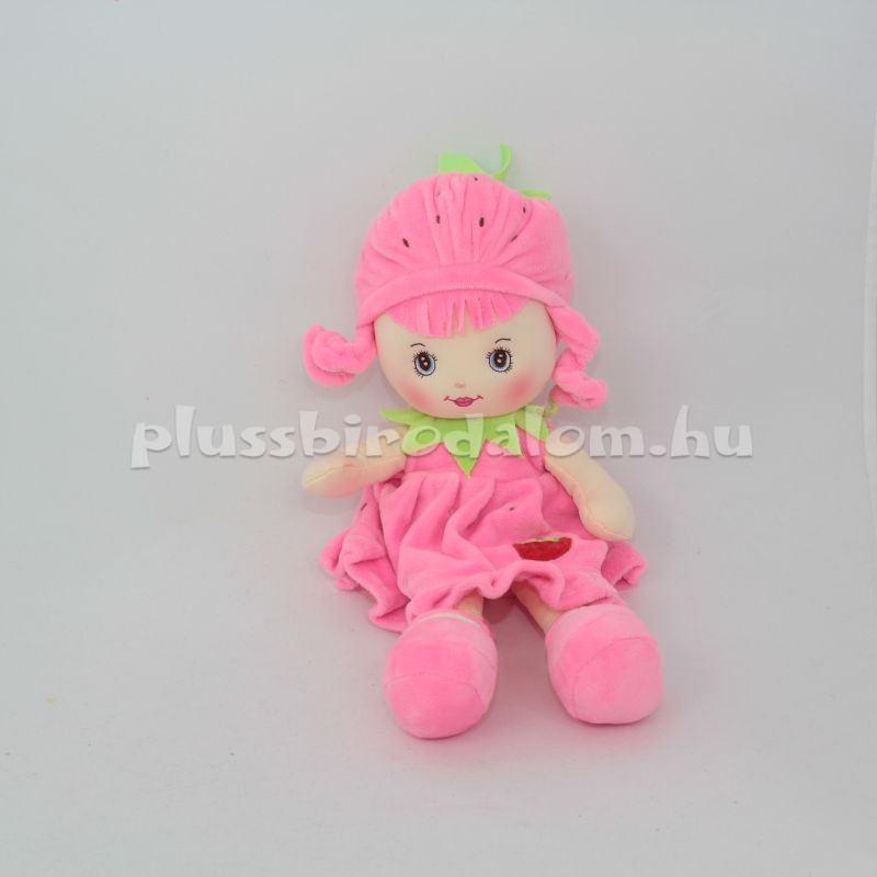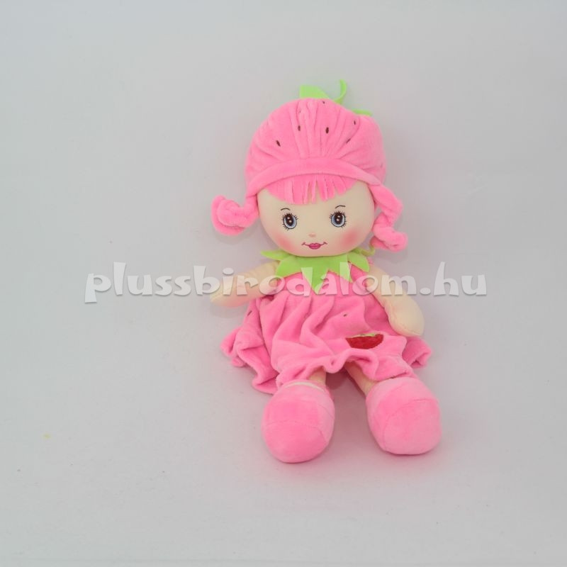 Plüss "Eperke" rongybaba, rózsaszín színű kalapban és ruhácskában.