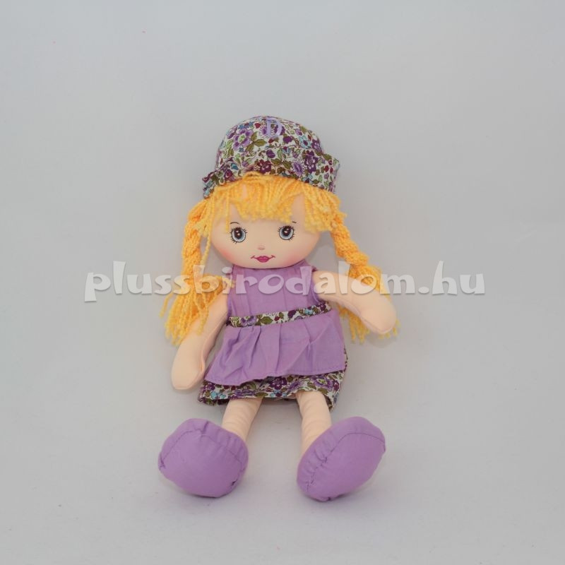 Plüss rongybaba, szőke befont hajjal, virágmintás sapkában,