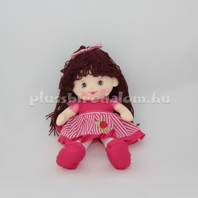 Plüss rongybaba, sötétbarna kibontott hajjal, piros-fehér csíkos masnival a hajában,
