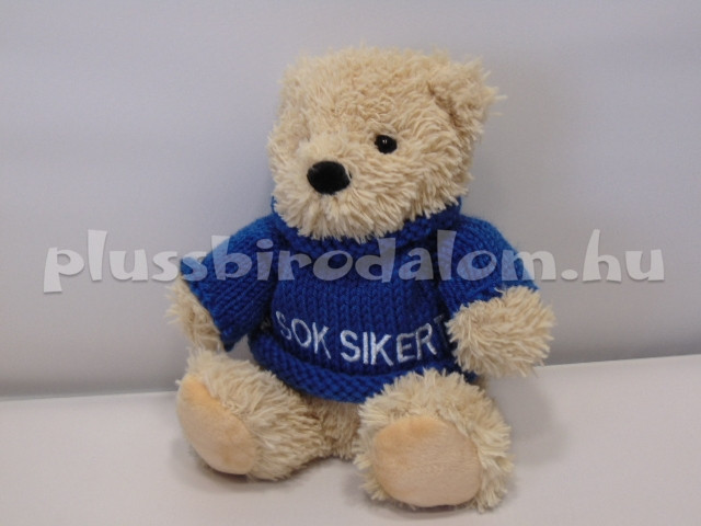Plüss Maci"Sok Sikert" feliratú pulóverben 18 cm.