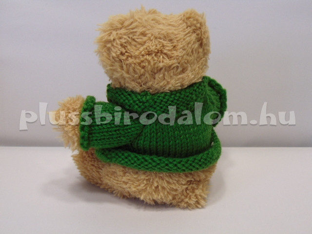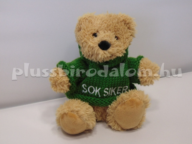 Ülő, barna színű, "SOK SIKERT" feliratú zöld pulcsiban 18 cm