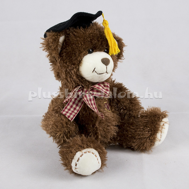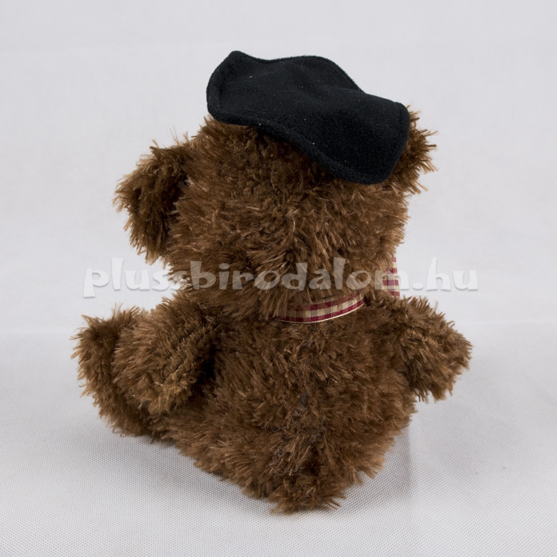 Ülő,sötétbarna színű, ballagó sapkában, piros-fehér kockás sállal. 20 cm