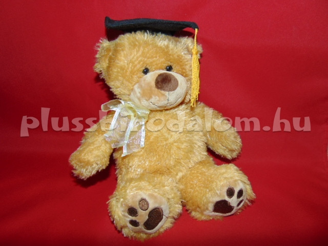 Ülő,aranybarna színű, ballagó sapkában,világos színű masnival. 20 cm