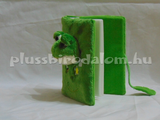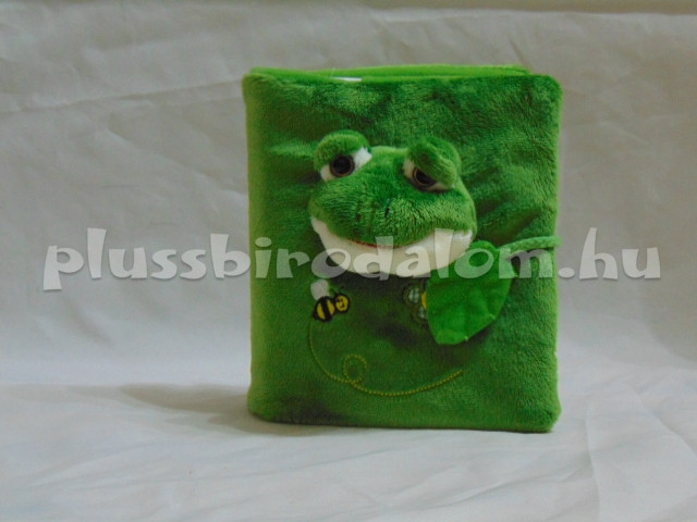 Plüss borítású fotóalbum, sötétzöld színű, béka fejjel az elején.