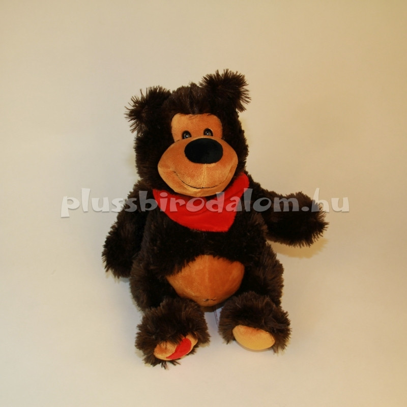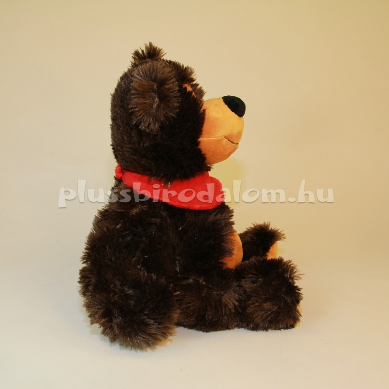 Ülő, sötétbarna színű, piros sállal a nyakában. Ülő magassága: 30 cm