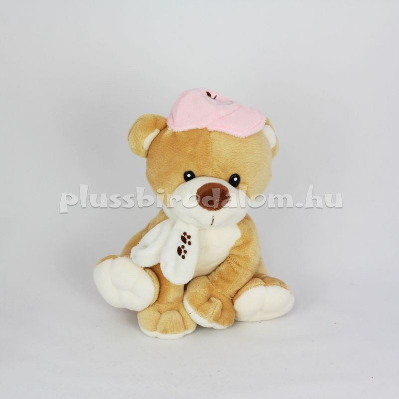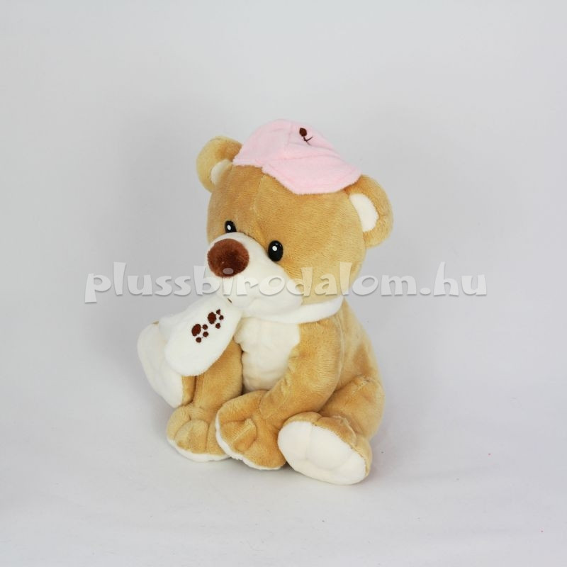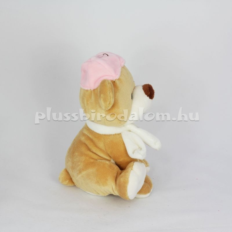 Ülő, rózsaszín kis sapkában, tappancsmintás sállal, drapp színű. Ülő mérete 20 cm.