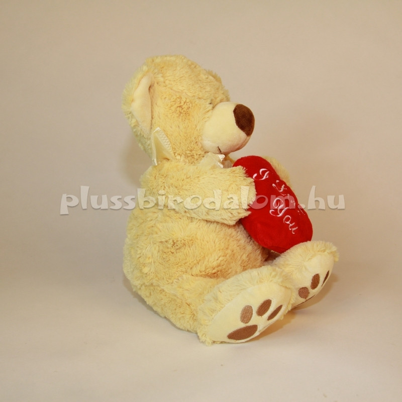 Zsemleszínű, ülő kivitelű, sárga masnival a nyakában, piros szívecskével a mancsában.