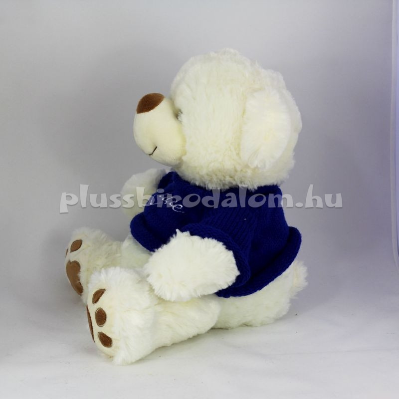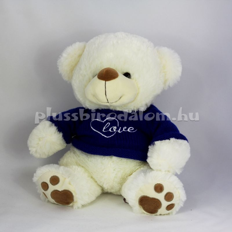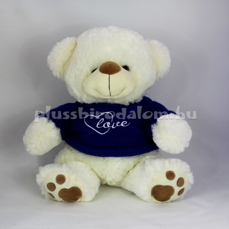 Ülő, sötétkék pulcsiban, "love" felirattal, fehér színű. Ülő magassága: 35 cm