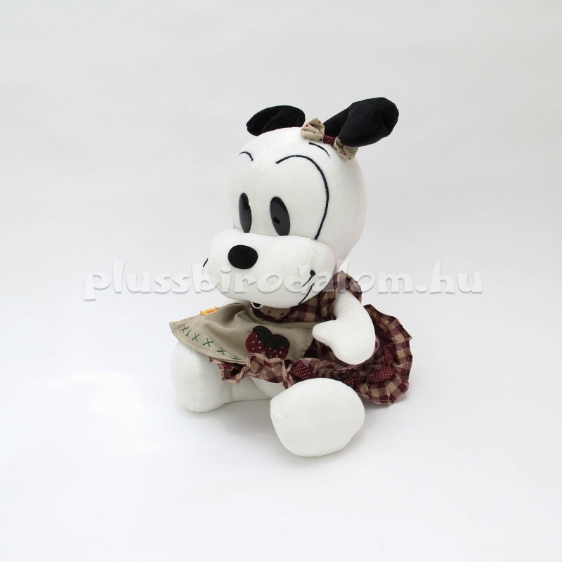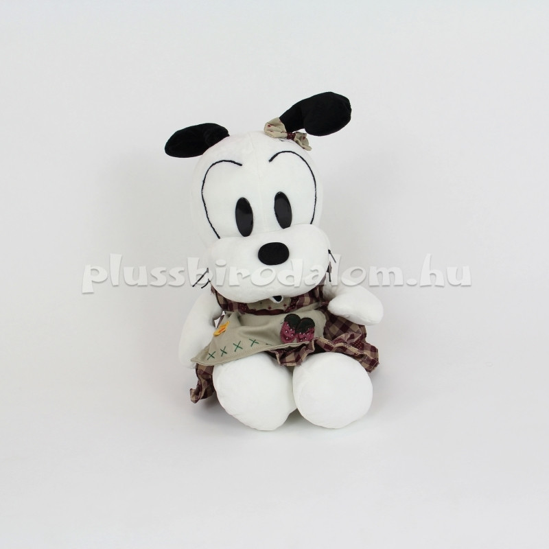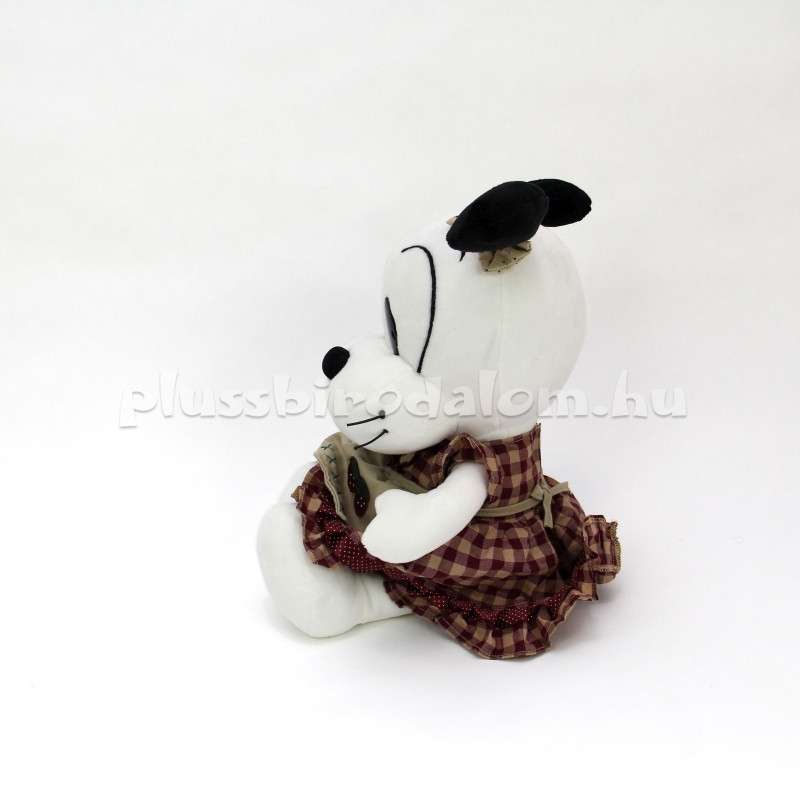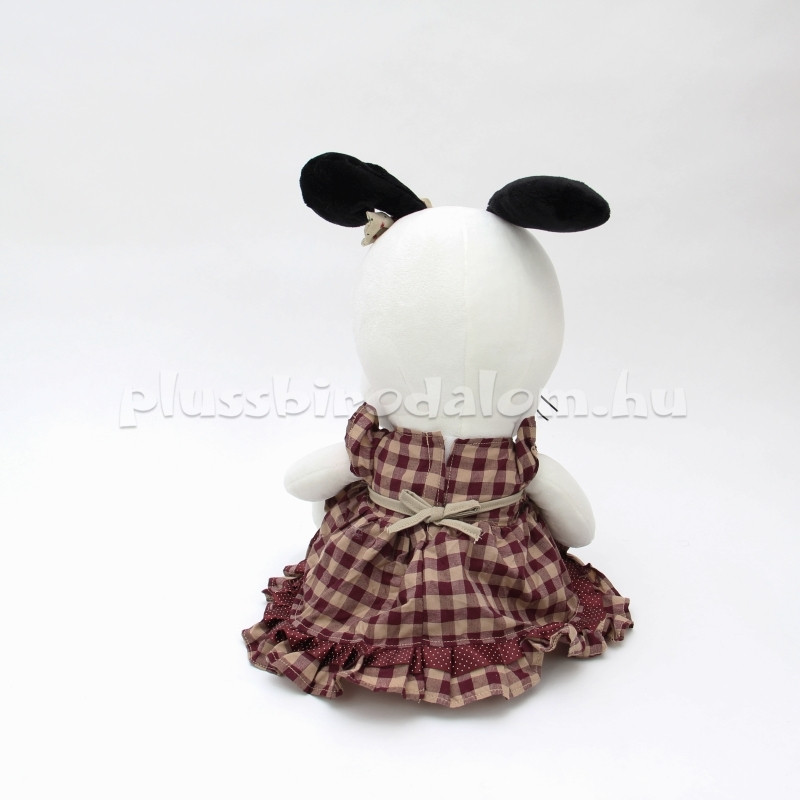 Plüss kutyus figura, kockás ruhácskában, masnival a fején.